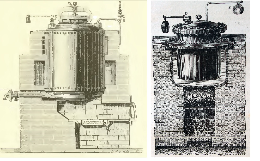 Black hall-Slights ‘ autoclave was single hulled, had an oval cross section and was except the front and top fully together with the firebox walled. On top of the autoclave there was a safety valve/pressure regulator and a valve for venting the air, for feeding water and bleeding of pressure. The front had a draining valve for fat and gluewater and a manhole for filling and discharging the boiled mass. The sealing of the manhole cover was done with a clamp, with hemp twine and oatmeal was used as “sealing stuffing”.